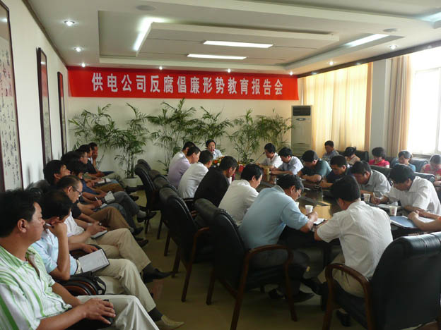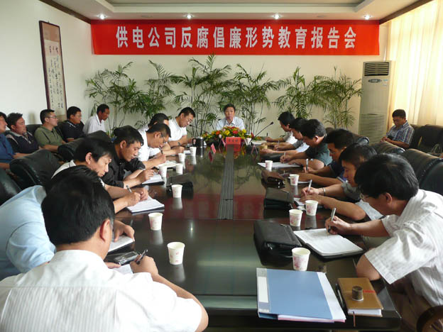 近日,我公司邀請了市紀委常委、市紀委秘書長、市監察局副局長雷生保同志來我公司作反腐倡廉形勢教育報告,公司領導、機關中層干部、各供電所領導班子及部分職工代表參加了會議。